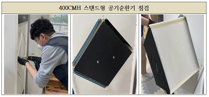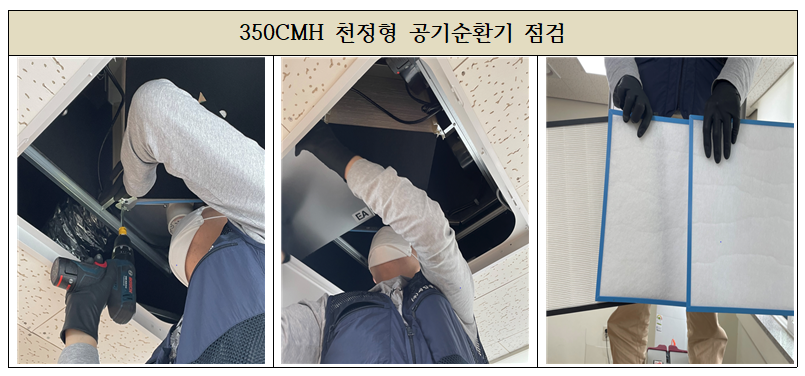 공기청정기의 기기, 필터점검 및 청소작업으로 이루어졌습니다.