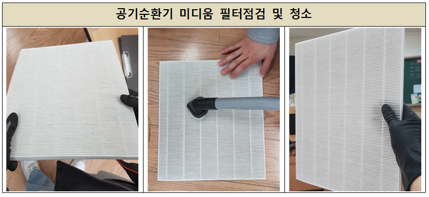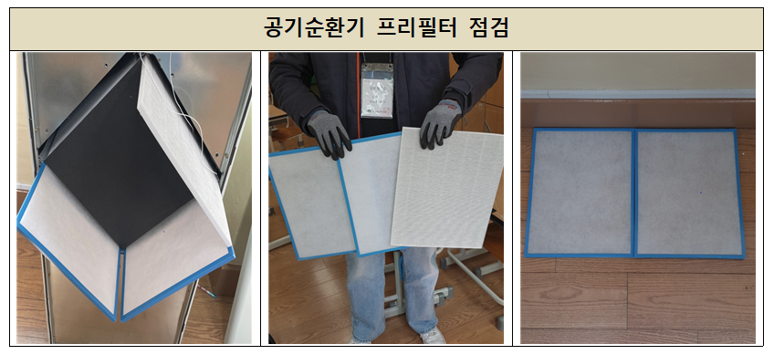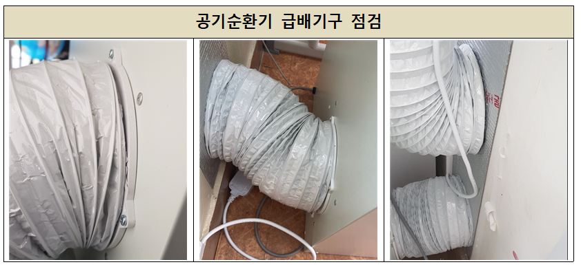 공기순환기의 기기 점검 및 필터 점검, 기기 급배기구 점검, 기기 소독 작업, 작동 및 기능 점검 후