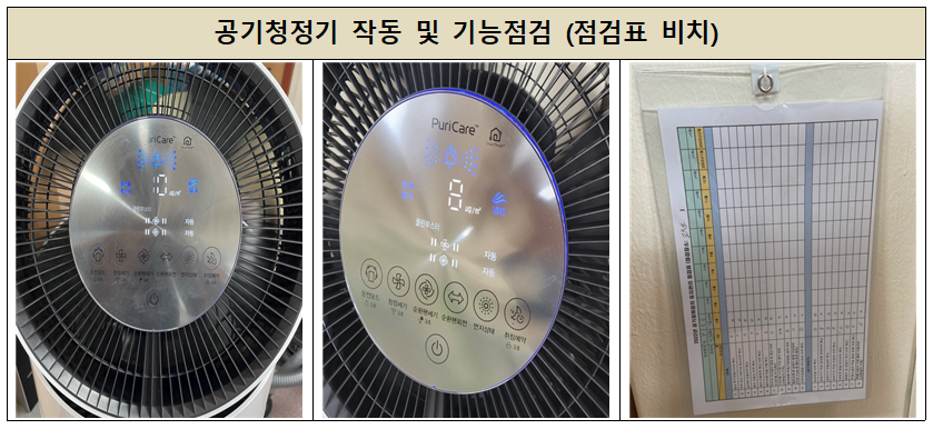 작업은 공기청정기의 기기 점검 및 복합필터 청소, 기기 내외부 청소, 기기 소독 작업, 작동 및 기능 점검과