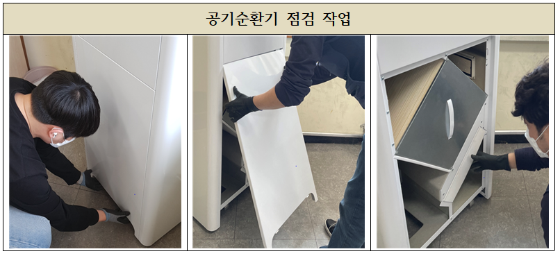 공기청정기는 기기 및 필터 점검후 청소, 소독작업을 진행했고