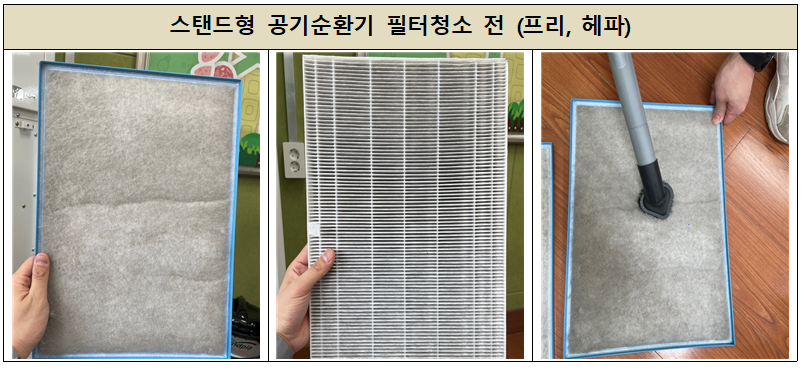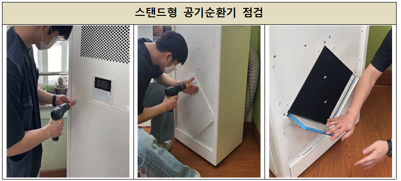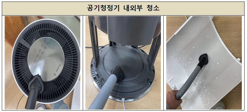 작업내용은 공기청정기의 복합필터 청소, 기기 내외부 청소, 소독작업, 작동 및 기능점검과