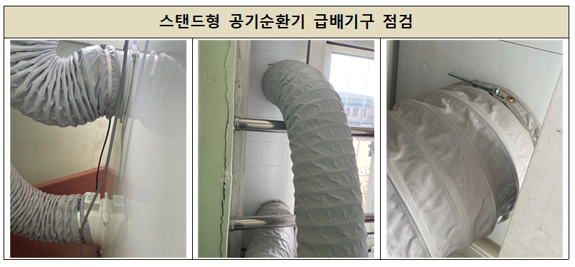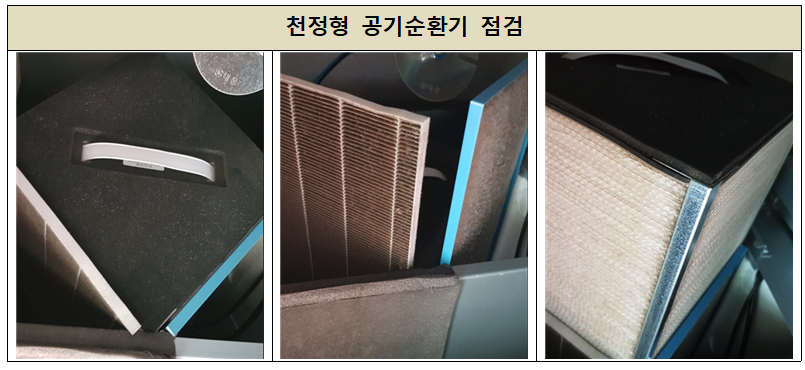 공기순환기의 기기 및 필터 점검, 급배기구 점검, 소독작업으로 이루어졌습니다.