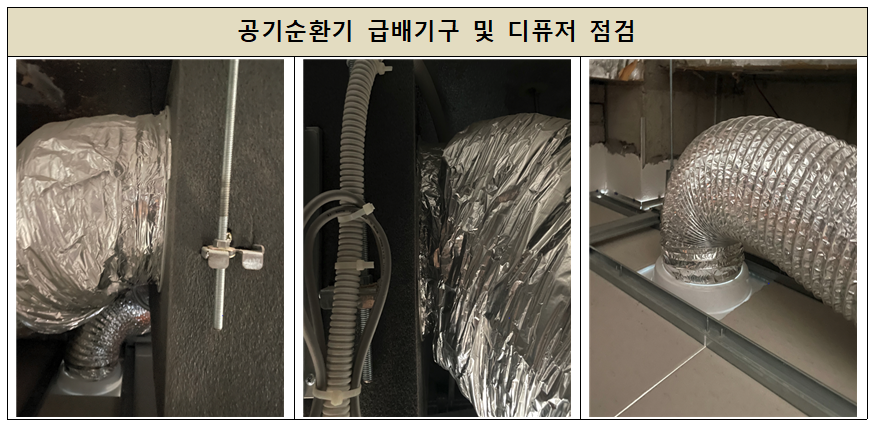 천정형 공기순환기는 기기와 필터 점검 및 청소작업, 급배기구 점검을 하고