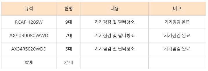 당사가 유지관리중인 모든 공기청정기의 점검 및 청소 작업을 완료 한후